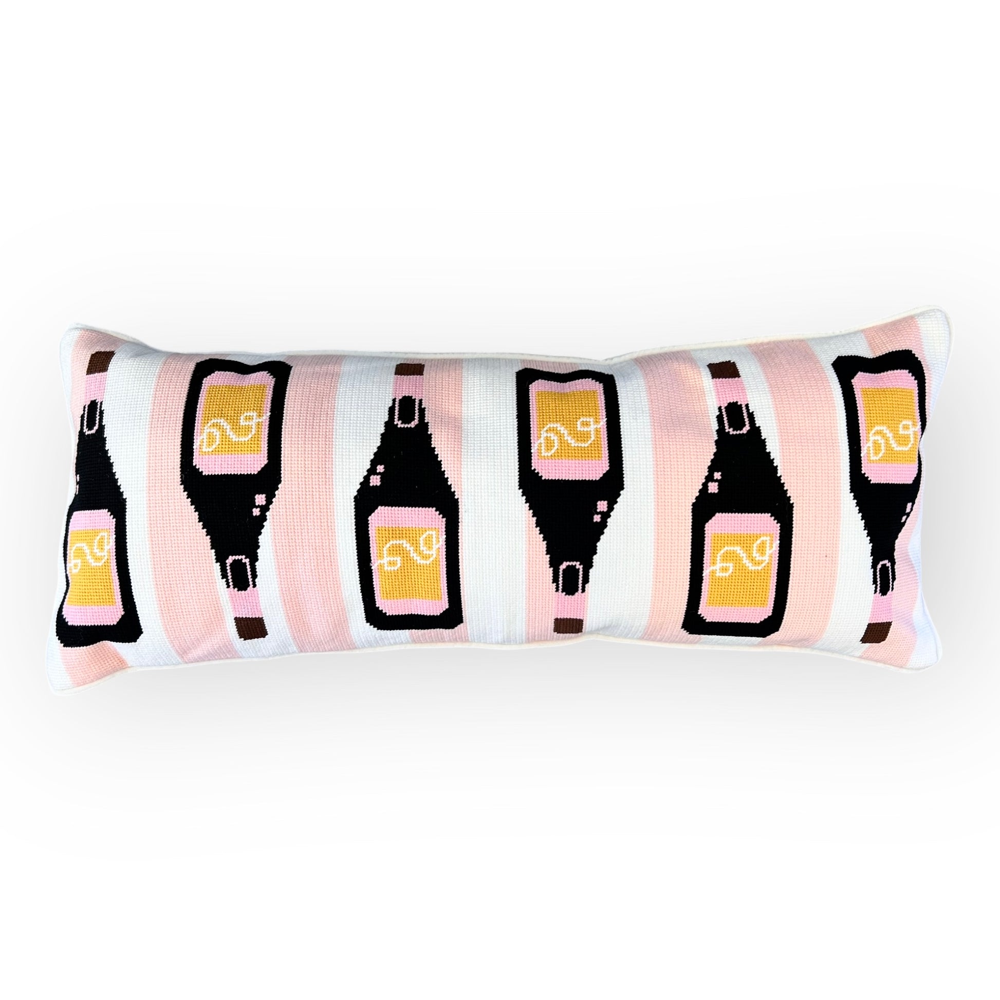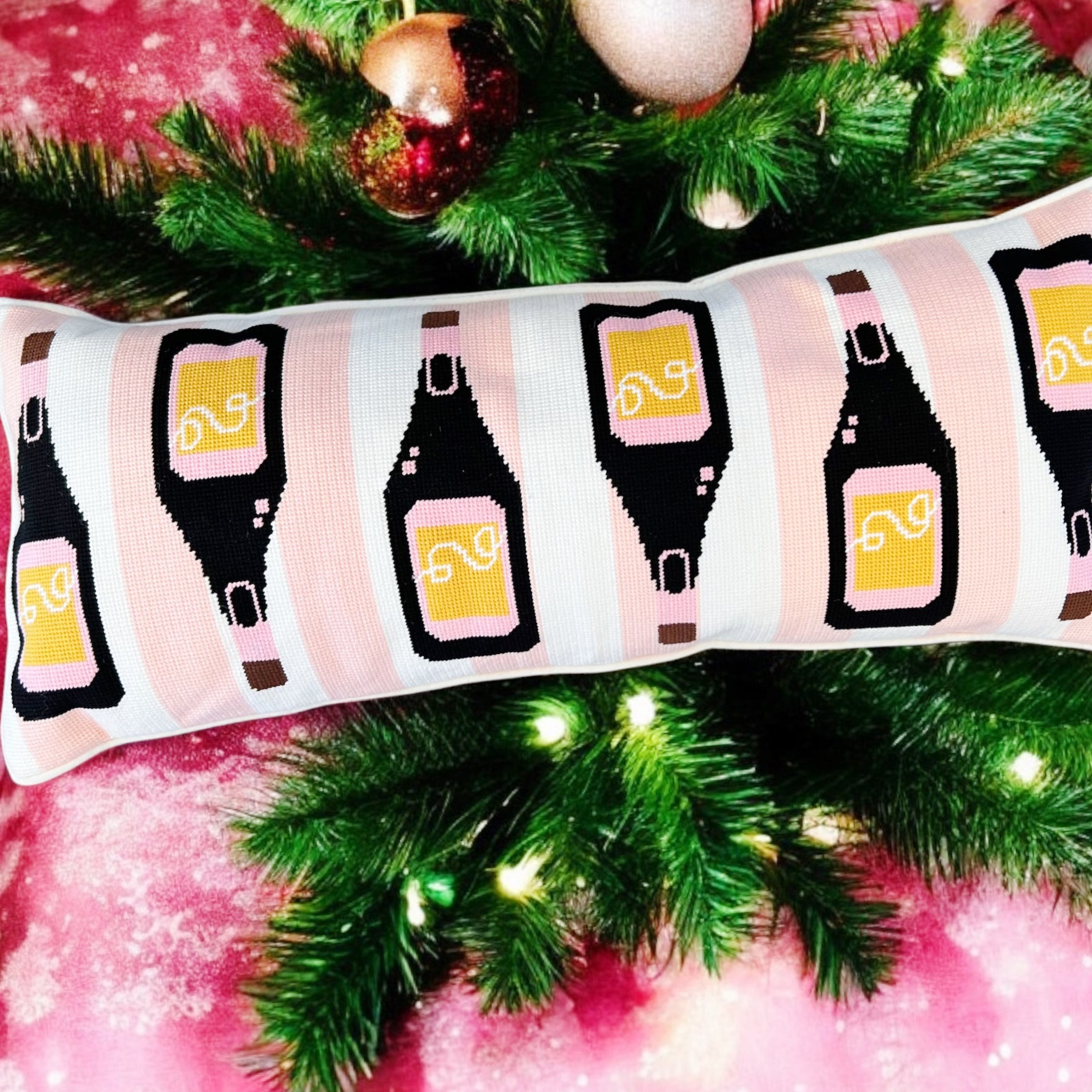 Add a touch of celebration to your space with the Pop the Bubbly Needlepoint Pillow! Featuring hand-stitched champagne bottles playfully arranged against a chic white and pink striped background, this stylish accent piece brings a festive flair to any room.